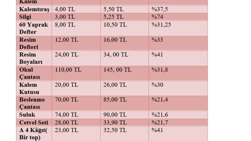 Farklı markalardaki ürünlerin farklı fiyatlarının asgari oranı temel alındığında, bir adet silginin fiyatında 2 yıl öncesine göre yüzde 74, kurşun kalemin fiyatında yüzde 70, resim boyalarının fiyatında ise yüzde 41 oranında artış olduğu gözlemlenmektedir.