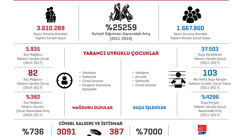 Özellikle cinsel suçlara karışan yabancı uyruklu çocuk sayısında büyük artış yaşandı. 2011 yılında 2 olan zanlı sayısı 2017 yılında 142’ye yükseldi. 2011-2017 yılları arasında toplam 387 çocuk zanlı olarak güvenlik birimlerine getirilirken, yaşanan artış yüzde 7000 olarak kayıtlara geçti.
