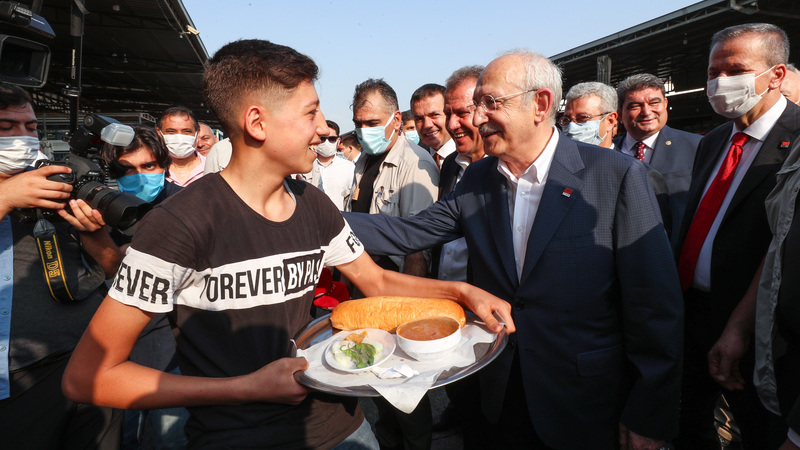 Mersin Yaş Sebze ve Meyve Komisyoncuları Derneği Başkanı Münir Şen ile hal esnafını gezerek, onlarla sohbet eden ve ürünleri inceleyen Genel Başkan Kılıçdaroğlu, gezisi sırasında "İsterseniz size lokantamızda yemek ısmarlayalım." diyen bisikletli kuryeye, "Şimdi yapamam bu kalabalıkta." yanıtını verdi.