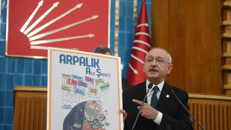 Bakın bu tablo, Türkiye tablosu bu tablodur arkadaşlar. Türkiye tablosu bu tablodur. Bu tablonun arkasında milyonlarca işsiz var. Bu tablonun arkasında geçinemediği için intihar eden vatandaşlarım var. Bu tablonun arkasında çocuğunu akşam yatağa aç yatıran annenin dramı var. Bu tablo, bu karikatür, bir Türkiye gerçeğini bundan daha iyi anlatamaz. Bir tarafta işsizlik var, bir tarafta önünde dolarlar, yedikçe doymayan bir grup var, yedikçe doymayan bir grup var.