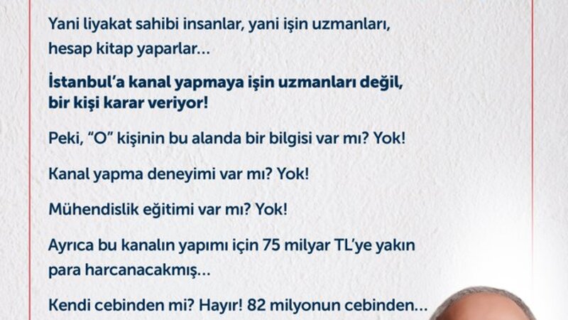 CHP Genel Başkanı Kemal Kılıçdaroğlu,"Demek ki “Tank Palet Fabrikası” yetmedi, şimdi de İstanbul’u peşkeş çekeceksin!" dedi.