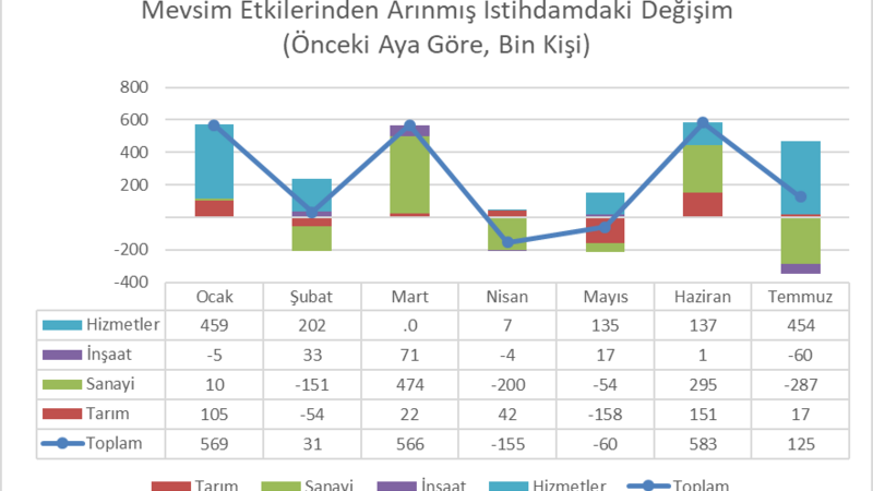 Geçtiğimiz yıl 16 Nisan’da başlayan “işten çıkarma yasağı” bu yıl 1 Temmuz’da sonlandı. Temmuz’da sanayide işten çıkarmalar başladı. Bu ayda sanayide çalışan sayısı 287 bin kişi gerilemiş, inşaat sektöründe de 60 bin kişilik düşüş var. Hizmet sektöründe çalışan sayısı ise 454 bin kişi artmış.