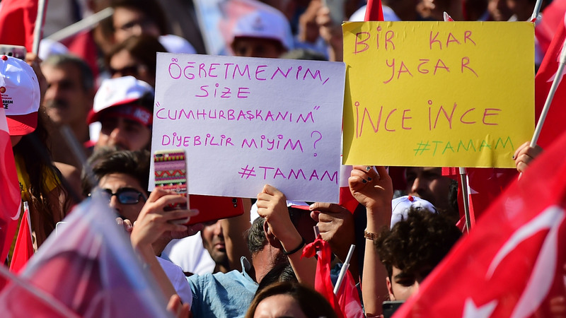İnce, Danıştay üyesinin aleyhinde tweet attığını, kaymakamın milletvekili adayının mikrofonu tuttuğunu, kendisinin eleştirildiği toplantıda bir generalin Erdoğan'ı alkışladığını dile getirerek, şöyle devam etti: