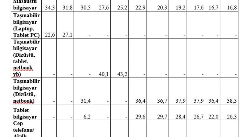• Hanelerdeki bilişim teknolojileri bulunma oranına bakıldığında ise, 2021 yılında hanelerdeki masaüstü bilgisayar sahiplik oranı yüzde 16,8 olarak gerçekleşirken, hanelerdeki taşınabilir bilgisayar oranı yüzde 38,3’te kalmıştır. Hanelerdeki tablet bilgisayar sahiplik oranı ise yüzde 26,3’tür.