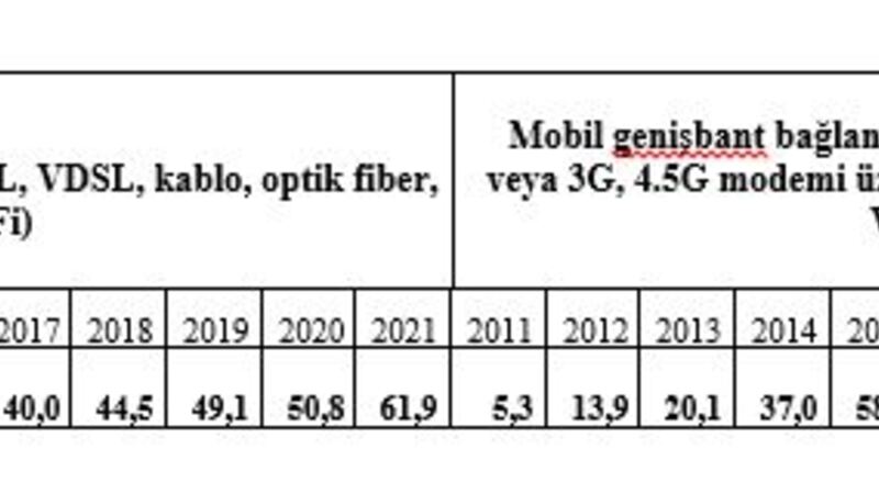 • 25 Ağustos 2020 tarihinde yayımlanan “Hanehalkı Bilişim Teknolojileri (BT) Kullanım Araştırması, 2020” verilerine göre, sabit genişbant bağlantı (ADSL, kablolu İnternet, fiber vb.) ile internete erişim sağlayan hanelerin oranı yüzde 50,8’de kaldı.