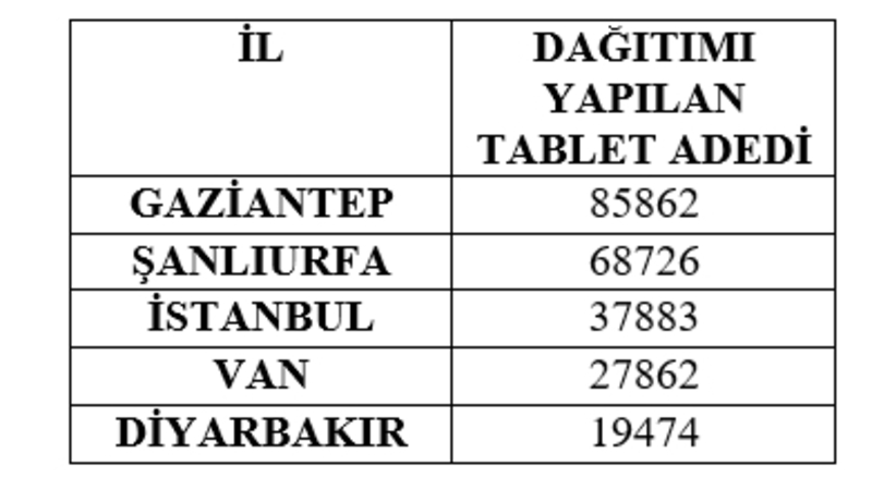İllere göre dağıtılan tablet sayısı şu şekildedir: