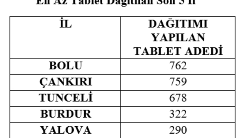 Yalova ile birlikte en az tablet dağıtılan iller ise Bolu, Çankırı, Tunceli ve Burdur olarak açıklandı.