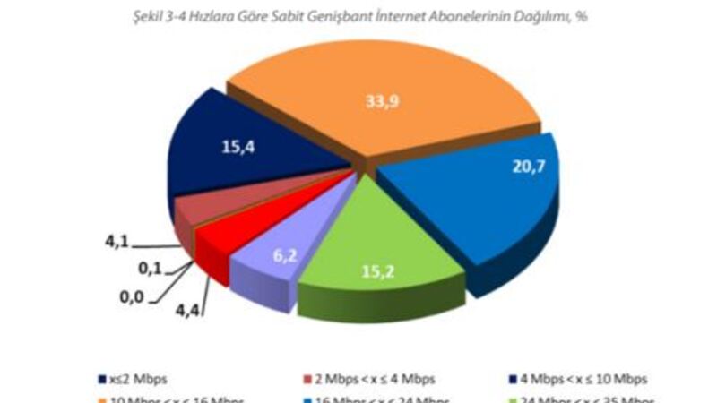 Öte yandan Bilgi Teknolojileri ve İletişim Kurumu’nun (BTK) güncel verilerine göre Türkiye’deki sabit genişbant abonelerinin yaklaşık %33,9’unun 10-16 Mbps hızla internete bağlandıklarını söyleyen Adıgüzel, “Sabit genişbant internet abonelerinin hızlara göre dağılımına baktığımızda, %33,9’nun 10-16 Mbps, %20,7’nin 16-24 Mbps, %15,2’sinin ise 24-35 Mbps arası internet hızına sahip olduğunu görüyoruz. 2-4 Mbps arası kullananların oranı %4,1, 4-10 Mbps arası kullananların oranı yüzde 15,4. 50 – 100 Mbps hız kullananların oranı ise sadece %4,4: