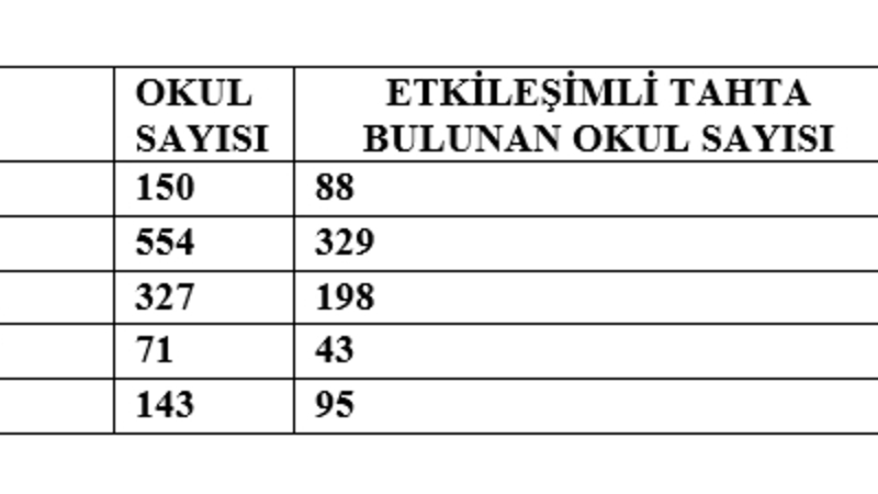 Etkileşimli tahta bulunan okul oranı en düşük rakama sahip ilk 5 il sırasıyla Şırnak, Şanlıurfa, Hakkari, Mardin ve Van olarak açıklandı. Buna göre etkileşimli tahta bulunan okul oranı Şırnak’ta yüzde 15,15; Şanlıurfa’da yüzde 20,28; Hakkari’de yüzde 22,22; Mardin’de yüzde 23,82; Van’da ise yüzde 23,89 oldu: