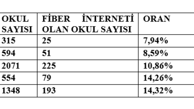 Fiber interneti olan okul oranlarında ise daha vahim bir tablo önümüze çıkıyor. Okullarda hızlı, güvenli ve kesintisiz internet erişimi için fiber altyapının önemli olduğuna vurgu yapan Adıgüzel, “Türkiye genelindeki 47 bin 300 okulun yalnızca 13 bin 489’unda fiber internet bulunuyor” dedi. Buna göre fiber internet oranının en düşük olduğu il yüzde 7,94’le Hakkari: