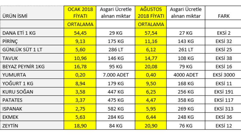 Yukarıda verilen temel besin maddelerinin Ocak ve Ağustos ayı arasında ki fiyat farklarında yaşanan değişim neticesinde, Asgari ücret ile geçinen 4 kişilik bir ailenin mutfağında ki temel besin gıda oranlarının alımında ki düşüş dikkat çekmektedir.
