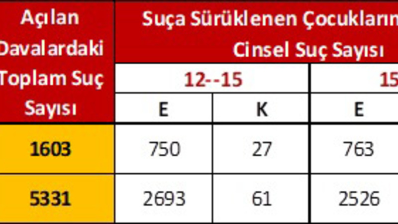 2017 yılında çocuklar tarafından işlenen cinsel suç sayısı 1.603 iken bu rakam 2018 yılında yüzde 233 artışla 5.331 olarak kayıtlara geçti. Bu rakam çocuklar tarafından 2018 yılında işlenen 187.601 suçun yüzde 3’üne denk geliyor.