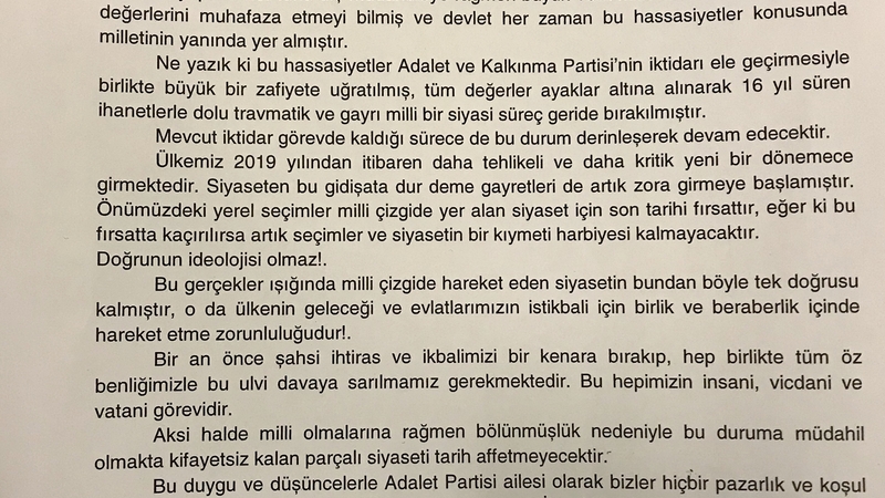 Mektupta özetle, “Adalet Partisi ailesi olarak bizler hiçbir pazarlık ve koşul öne sürmeden 41 yeterliliği tamamlanmış toplam 56 il teşkilatımızLa vatan uğruna “Birimiz Hepimiz, Hepimiz Birimiz İçin” anlayışıyla 31 Mart 2019 yerel seçiminde Türkiye genelinde Cumhuriyet Halk Partisinin yanında olduğumuzu ifade etmek isteriz” deniliyor.