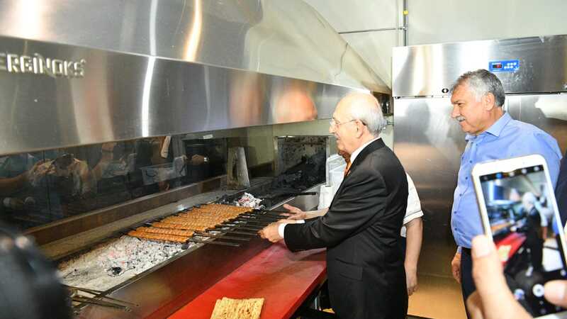 CHP Genel Başkanı Kemal Kılıçdaroğlu, daha sonra bir otelde düzenlenen yemeğe katılarak mangalın başına geçip Adana kebabı çevirdi.