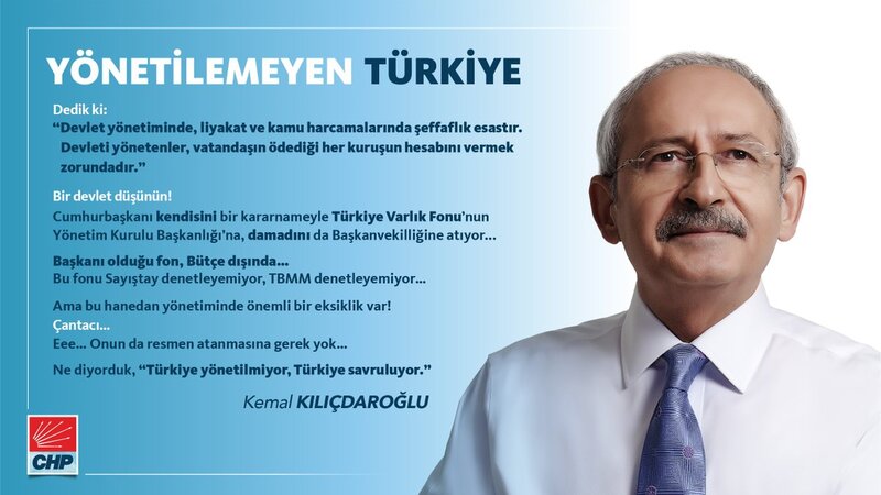 CHP Genel Başkanı Kemal Kılıçdaroğlu, "Bir devlet düşünün! Cumhurbaşkanı kendisini bir kararnameyle Türkiye Varlık Fonu’nun Yönetim Kurulu Başkanlığı’na, damadını da Başkanvekilliğine atıyor… Başkanı olduğu fon, Bütçe dışında… Bu fonu Sayıştay denetleyemiyor, TBMM denetleyemiyor…" dedi.