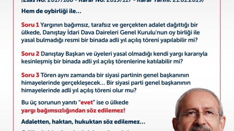 Soru 1 Yargının bağımsız, tarafsız ve gerçekten adalet dağıttığı bir ülkede, Danıştay İdari Dava Daireleri Genel Kurulu'nun oy birliği ile yasal bulmadığı resmi bir binada açılış töreni yapılabilir mi?