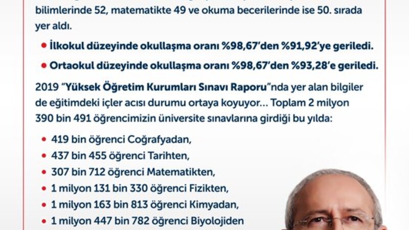 CHP Genel Başkanı Kemal Kılıçdaroğlu, "Son 17 yılda eğitimde çok ciddi bir çöküş yaşıyoruz. Sadece bugünü değil, geleceğimizi de kaybediyoruz…" dedi.