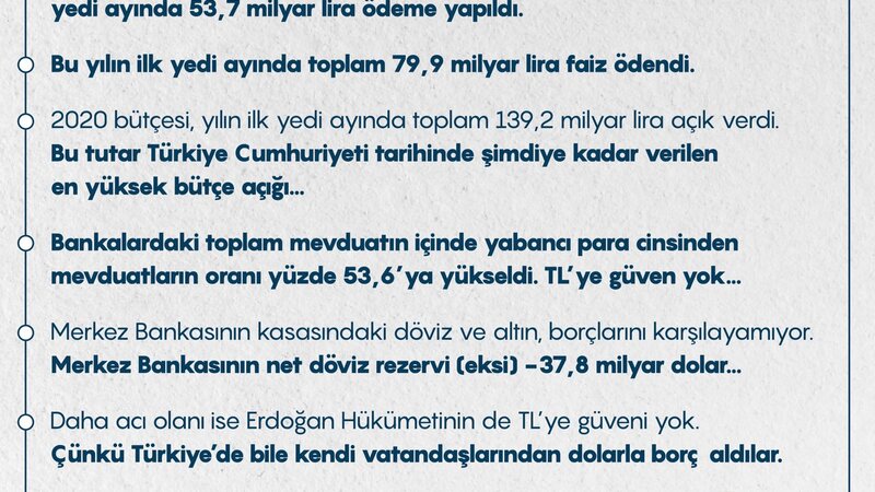 2020 bütçesi, yılın ilk yedi ayında toplam 139,2 milyar lira açık verdi. Bu tutar Türkiye Cumhuriyeti tarihinde şimdliye kadar verilen en yüksek bütçe açığı..