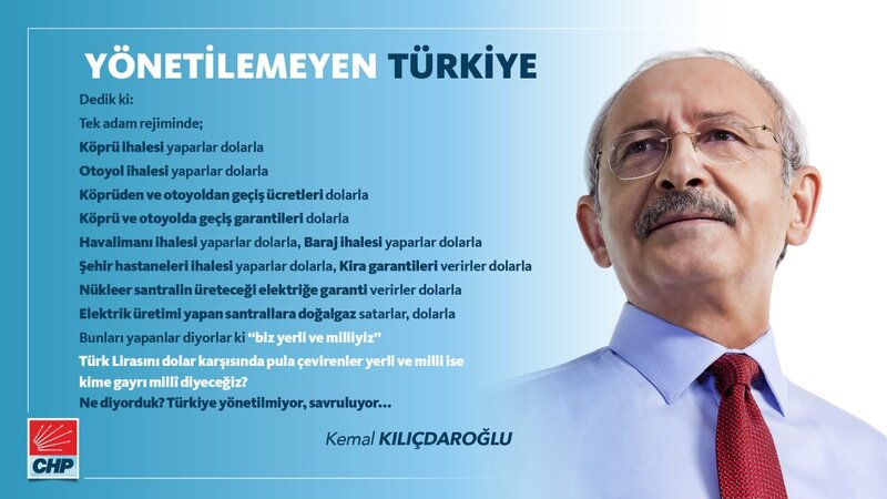 CHP Genel Başkanı Kemal Kılıçdaroğlu, "Türk Lirasını dolar karşısında pula çevirenler yerli ve milli ise kime gayri milli diyeceğiz? Ne diyorduk? Türkiye yönetilmiyor, Türkiye savruluyor…" dedi.