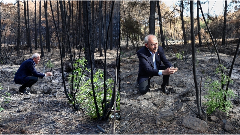 CHP Genel Başkanı Kemal Kılıçdaroğlu, Muğla’da yanan yerlerdeki incelemesini Marmaris’in Osmaniye Mahallesi’nde sürdürdü. Kılıçdaroğlu, yanmış ağaçların arasında girerek, yeşeren ağacın fotoğrafını kendi telefonuyla çekti. Kılıçdaroğlu, ağacı çekerken çömelerek, yeşillenen ağacı fotoğraf karesine sığdırdı.