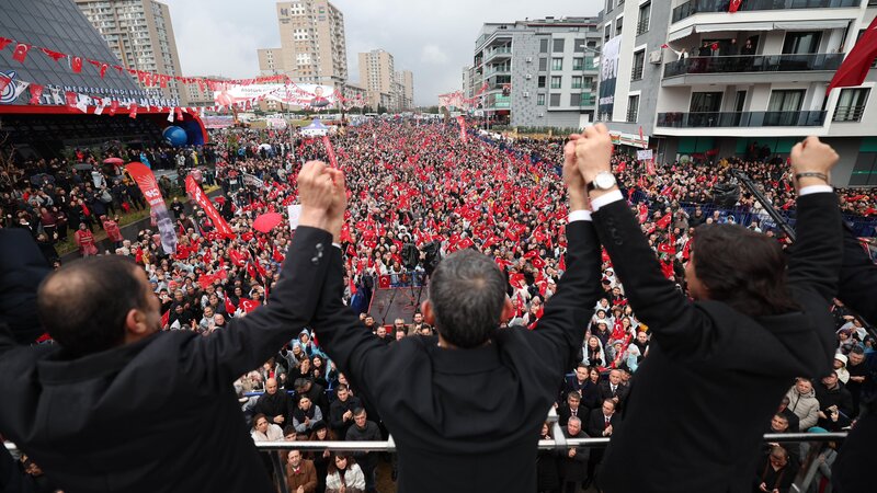 “AK Parti’nin kara düzeni, AK Partilinin de MHP’linin de emeğini sömürüyor. AK Parti’nin kara düzeni, AK Partili gençleri de işsiz bırakıyor. AK Parti’nin kara düzeninde ilk kez artık marketlerde, tarihi geçmiş gıdalar ‘fırsat reyonu’ diye utanç reyonlarında satılıyor. Ürün, peynirin tarihi geçmiş, fırsat reyonuna koyuyor. Patates cipsi alamamış çocuğuna. Tarihi geçmiş yerden, bir ay tarihi geçmiş cipsi, fırsat reyonundan alıyor gariban. Bunun partisi olmaz. Böyle bir ahlaksızlığa sabır olmaz. Yalanlarla sürdürülen iktidardan umut olmaz. Efendim, ‘Gelirlerse ezanı da dindirecekler’ vallahi yalan. ‘Bayrağı indirecekler’ vallahi yalan. ‘Vatanı böldürecekler…’ Hadi lan oradan, hadi lan oradan. Bunları diye diye oy toplayıp sonra kendisine yüzde 300, emekliye yüzde 12. Kendisine yüzde 300, asgari ücretliye yüzde 20. Bu düzeni değiştirmeye var mısınız? Tarihin en uzun, en kalabalık, en mücadeleci seçim sath-ı mailindeyiz. Bugün seçimin 298’inci günü. Çok kaçsalar, bininci güne kadar kaçarlar. Gerekirse bin günlük seçim kampanyası neferi olmaya var mısınız? Ekrem Başkan yerine cumhurbaşkanı adaylığına var mısınız? Kapı kapı gezmeye, köy gezmeye, bulup konuşup ikna etmeye, oyları teker teker toplamaya var mısınız? Yollarda, sokaklarda, köylerde ve fabrikalarda birlikte yürüyecek miyiz? Hadi o zaman yürüyelim arkadaşlar.”