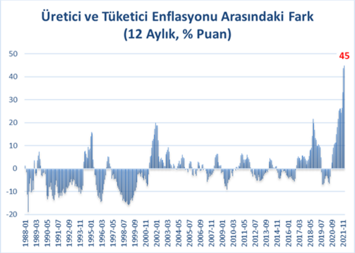 Ocak ayında üretici enflasyonu, tüketici enflasyonun altında kaldı. Ancak hala "turpun büyüğü heybede". 12 aylık üretici ve tüketici enflasyonu arasındaki fark 45 puan ile yine rekor tazeledi. Üretici fiyatlarından tüketiciye doğru korkunç bir tsunami gelmeye devam ediyor.